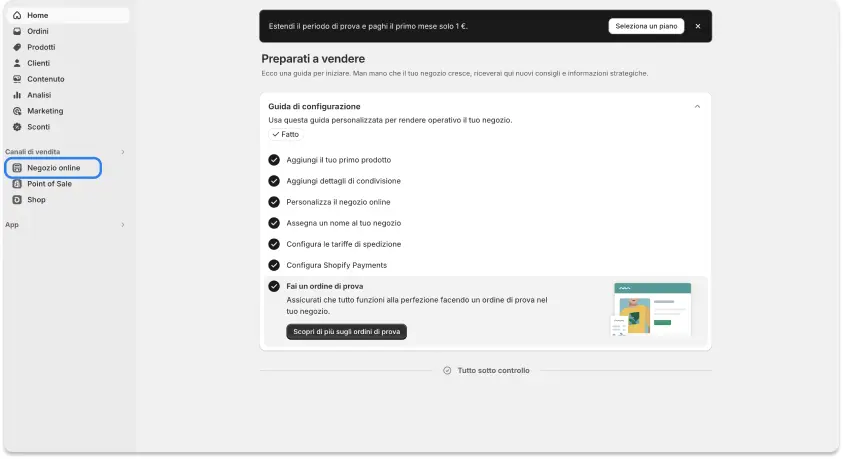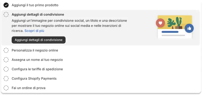 Nella pagina iniziale del tuo shop ora dovresti vedere una "guida alla configurazione", un elenco di passaggi per aggiungere prodotti al tuo negozio e personalizzarlo.