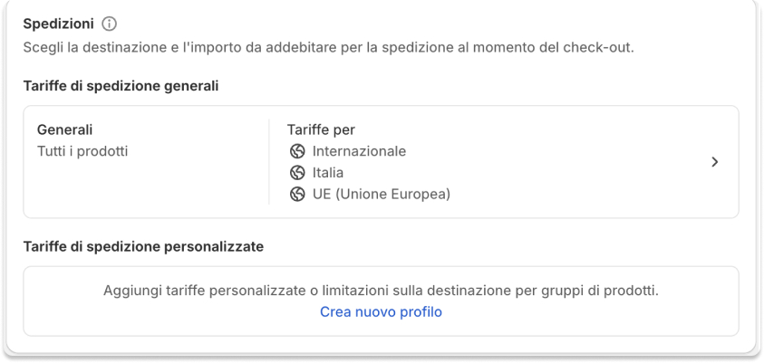 Puoi stabilire tariffe diverse per ciascun paese in cui effettui spedizioni, e il costo della spedizione verrà automaticamente aggiunto al checkout.