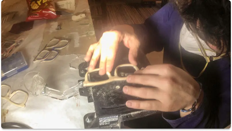 Ottenuti questi fogli di snowboard ed acetato, si tagliano dei blocchetti rettangolari che vengono fresati da un pantografo per occhiali.