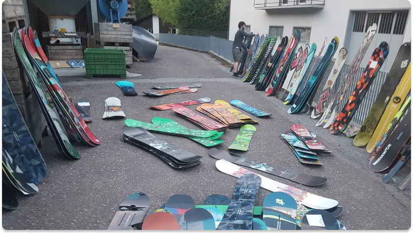 Passare dal processo di prototipazione a quello di produzione non è stato semplice. Il primo passo è stato recuperare le tavole da snowboard necessarie. Affittando un furgone, siamo andati in giro per affitta-sci e brand di snowboard chiedendo se potevamo avere le tavole vecchie. Questo è stato uno dei passi più semplici: tutti sono stati ben contenti di regalarci le tavole da snowboard che altrimenti avrebbero dovuto smaltire.