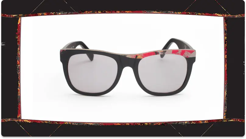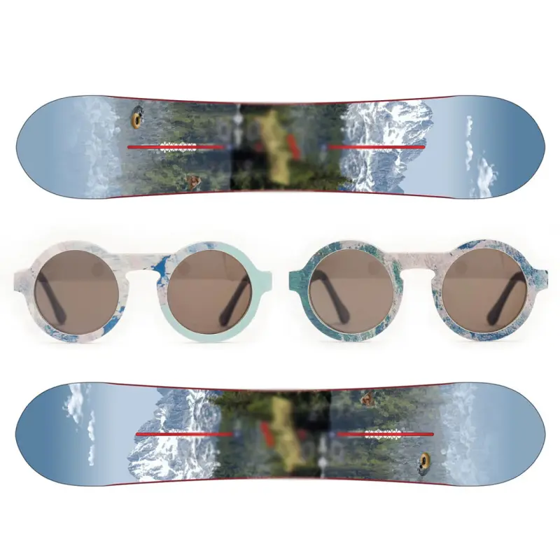 Il risultato ha caratteristiche estetiche uniche. Il materiale è un laminato di legno e top-sheet dello snowboard, e sul frontale, ogni occhiale presenta una parte del disegno della tavola, che diventa un pattern colorando la montatura.